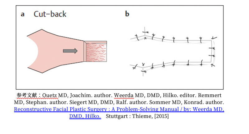最もオーソドックスな方法。瘢痕を切除し、端をきれいに寄せて縫合する方法。ただし、鍛錬を積んだ形成外科専門医だからこそできる極細の糸での中縫いとドッグイヤー(皮膚の盛り上がり)を意識したデザインで表面を美しく合わせられるかどうかで術後の経過が変わります。