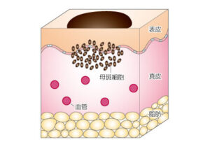 母斑細胞は中途半端にメラニン色素を作り、かつ増殖してしまうため部分的にメラニンがたまっていきます。